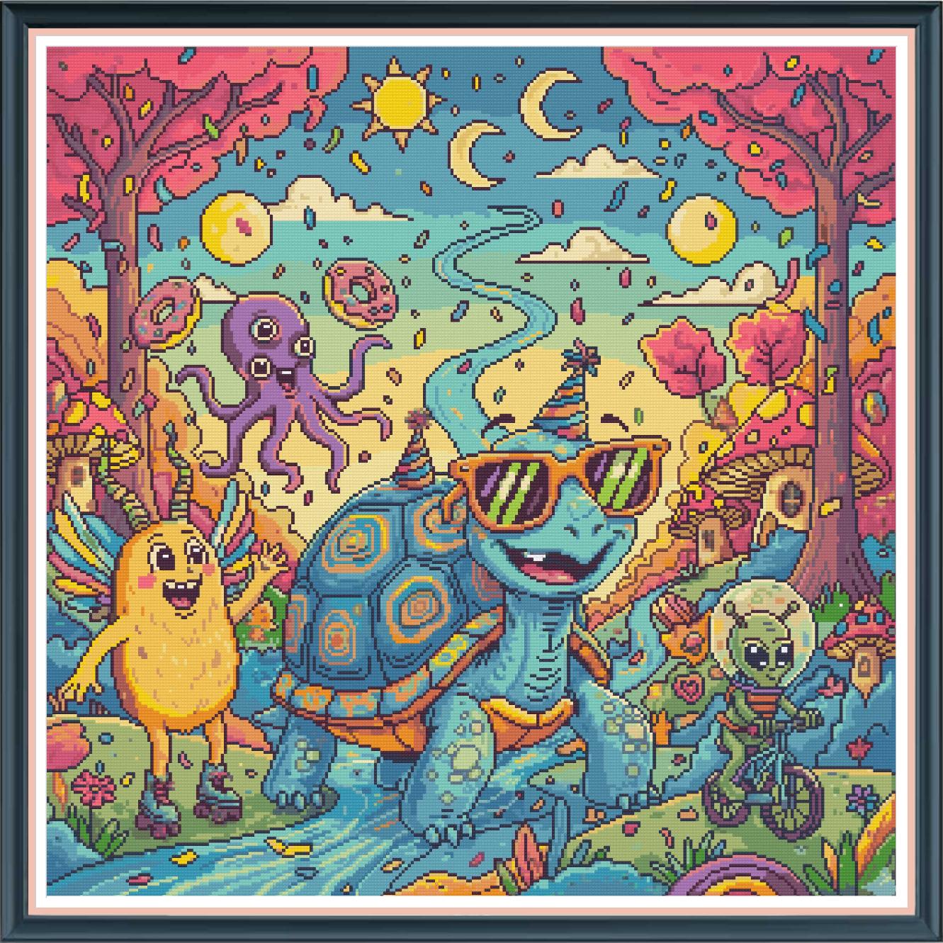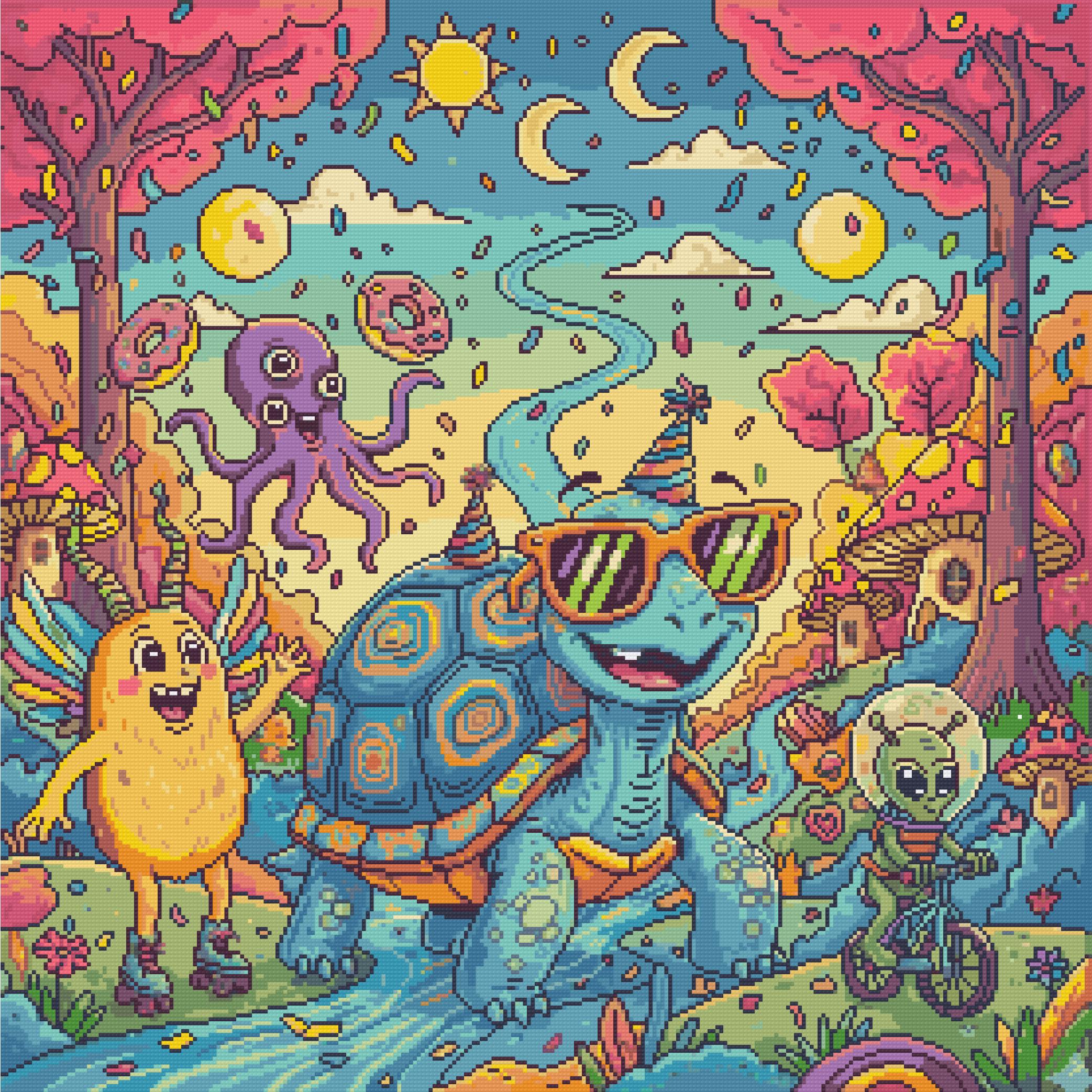 En un bosque de setas y árboles pastel, se juntan estraños con piel de oropel. Tortuga fiestera, alien sobre ruedas, y un monstruo alado que patina sin cuevas. Un pulpo de tres ojos y donas en el aire, en este mundo de locos nadie se distrae. Una explosión de color, una risa sin fin, donde cada criatura es su propio festín.
