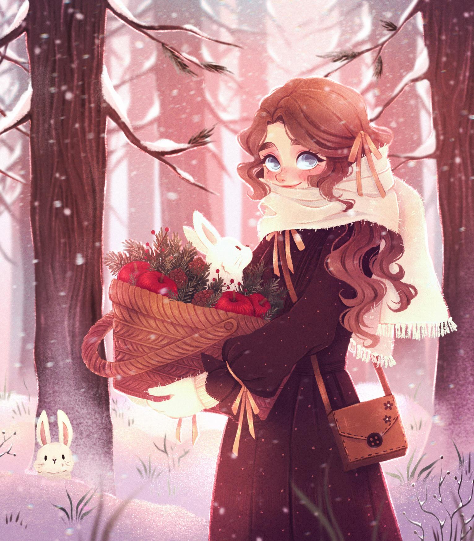 En una tarde fría de invierno, con el blanco impecable de la nieve, y los sonidos armónicos mezclados del viento que sopla. Las pequeñas criaturas del bosque tan bellas como la nieve misma a ella siempre le acompañan, pues ella es tan dulce y tan pura y en abundancia regala ternura. Mely recoge manzanas rojas que regala con bondad y todo el que la recibe siempre se acordará.